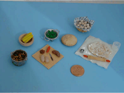 Make meat, potatoes, carrots, green beans, corn, biscuits, pie. Containers provided for preparation and cooking in your kitchen - cutting board, colander, stew pot, wooden bowls, basket, knife, and miscellaneous baking supplies. You decide on presentation - options provided.